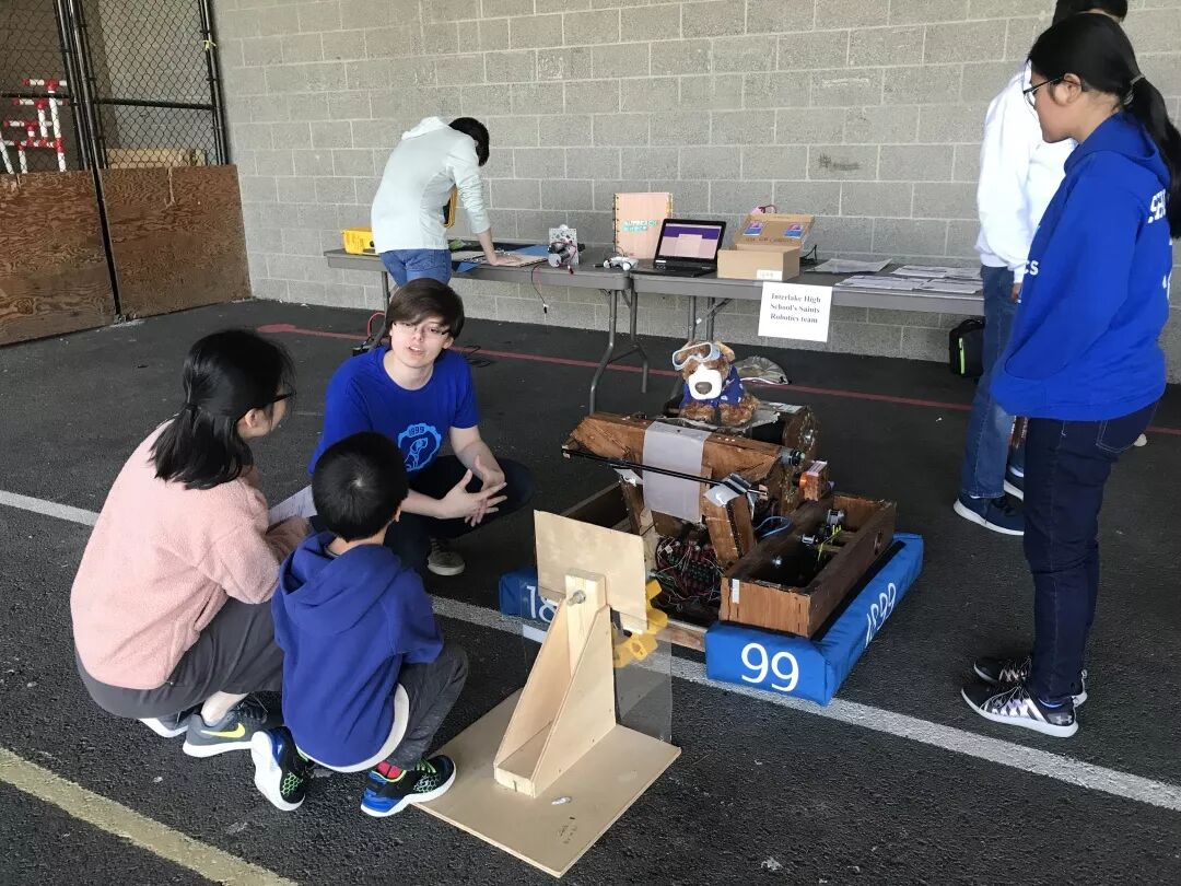 周边高中的学生,为孩子和家长讲解他们设计制造的机器人