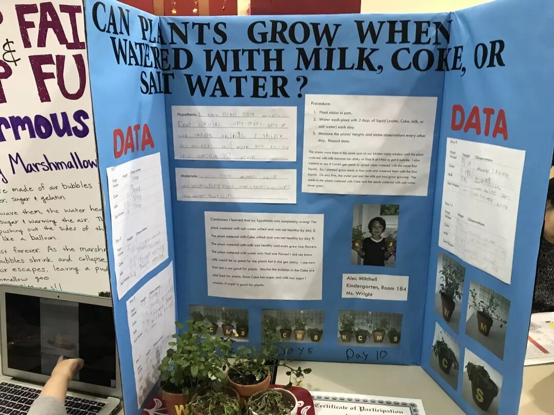 这幅照片是我在姑娘学校的科技上拍的。这是一个一年级的男孩子做的科技节展板。他研究的主题是“Can plants grow when watered with milk, coke, or salt water?”。请允许我用自己的语言将它翻译成:论在家里将不同液体长期倒进妈妈养的植物后,花儿们最终的死亡时间。