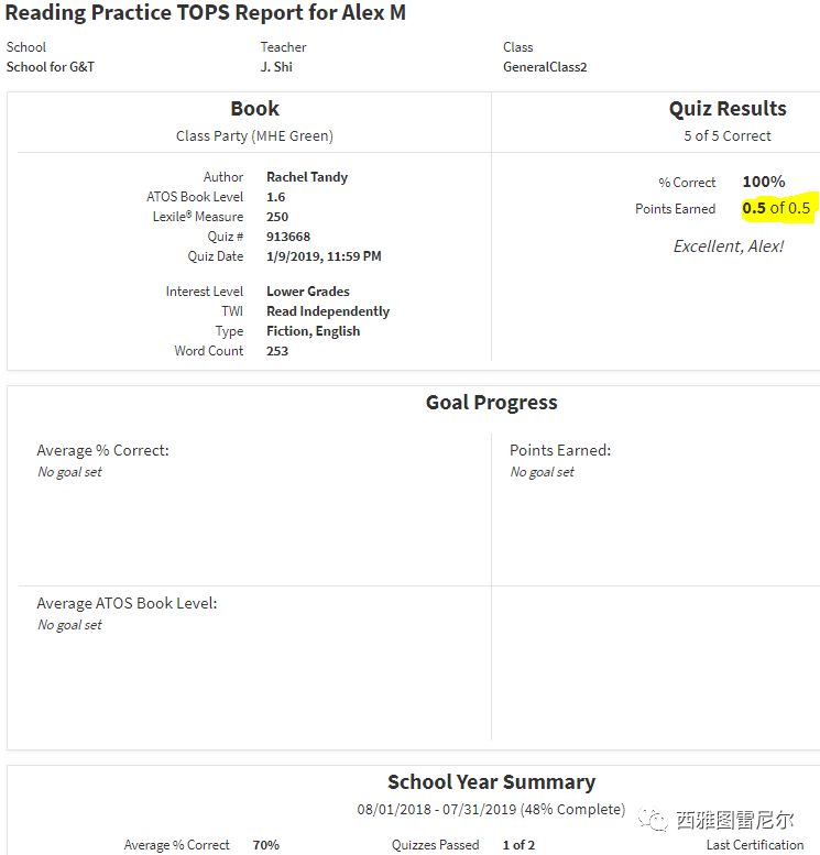 而且这套系统非常适合做reading intervention,比如老师可以Alex设定一个“2个月积30分的模式”,积分够了就让他再考试,看“升级”了没有的目标。(相当于两个月要读30~40本书,并且做完阅读理解)。两个月后,目标有没有完成,那个地方有薄弱,那个地方有改进,一目了然。而且真正做了,那么AR的分就会上去。这个刷分会非常辛苦,但是客观大大提高了阅读能力。