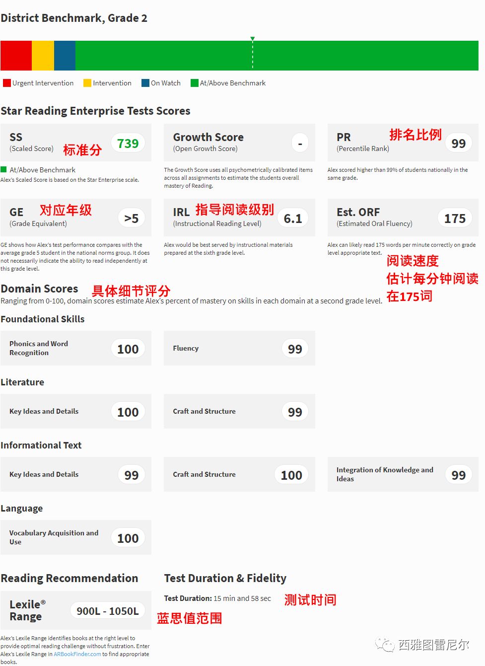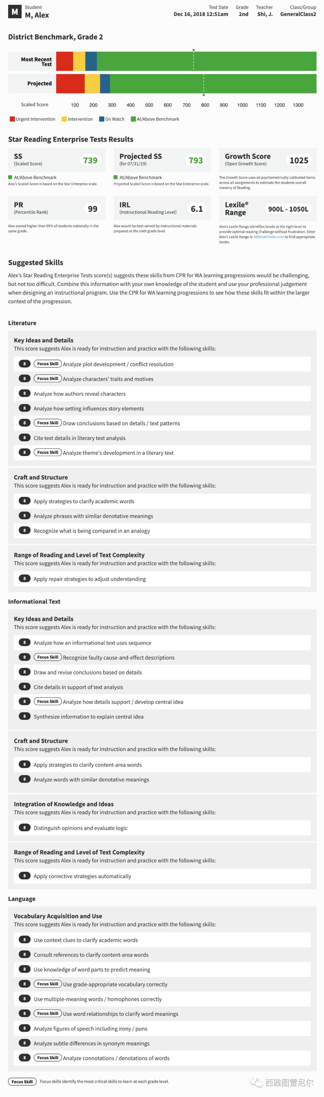 在这份报告中,还显示Alex的阅读水平高于本年级的标准(benchmark),在同年级学生中的百分比(Percentile Rank)为99,即他的阅读能力比99%美国同年级学生强。报告还显示,Alex的最佳教学程度(InstructionalReading Level)是6.1,即老师对他进行教学,最好是拿六年级水平的材料。