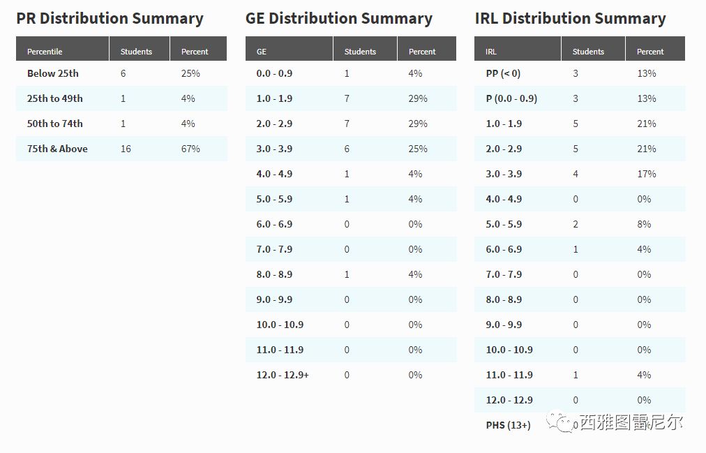 这套系统不仅仅对个体有非常详细的分析,还能看到对全班,全学区与全州的阅读能力水平的总结,本班学生与本校同年级学生相对比的总结、与全学区、全州、全国的学生相比的总结。