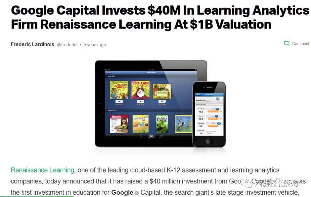 这要从Renaissance Learning这个公司说起,这家公司是历史悠久的教育公司,前面几十年一直不温不火。直到5年前被Google资本投资4千万美元之后,用技术改造之后,这家公司开始脱胎换骨,技术和产品都焕然一新。