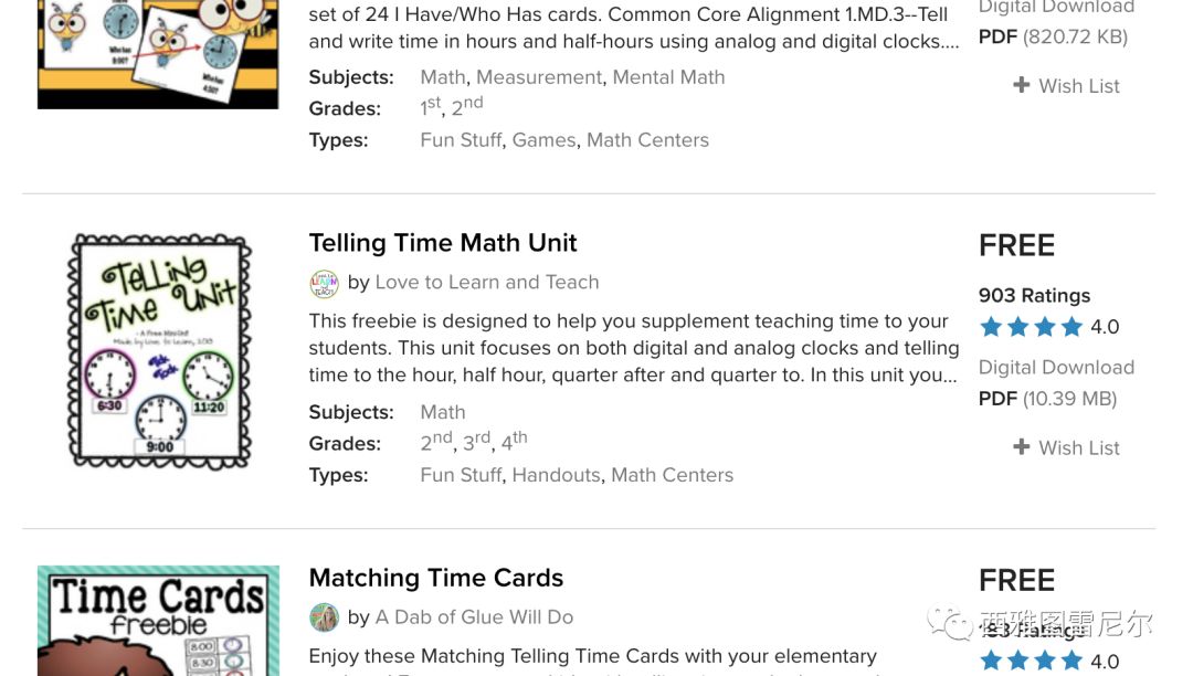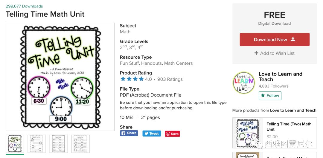 比如我想选择其中的一个材料“Telling Time Math Unit“看一下。就先点击这个标题,进入下载页面。之后我一般会点大图片下面的几张可预览的小图片,先看看该材料的设计大致是什么形式;再看看材料说明的最末尾一行显示的该材料多少页。这个材料是21页,说明内容还挺详实的。决定下载了,就按右边红色键”Download Now“。该材料就下载到你的电脑了。